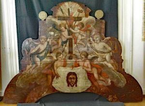 Auf der Türtafel wird dem Betrachter der Sündenfall der Menschheit angedeutet. Hier sind unsere Stammeltern Adam und Eva unter einem Apfelbaum dargestellt. Darüber erkennt man zwei Bildtafeln mit den Szenen, die das Leiden Christi symbolisieren, nämlich die Geißelung und die Dornenkrönung. Die aus Holz gefertigten Kulissen, welche diese Schaubühne umrahmen, sind jeweils mit einem weissagenden Propheten aus dem alten Bund bemalt. Über der Gesamt-konzeption tragen nette typisch gestaltete Barockengel die Marter-Werkzeuge, die wir aus der Leidensmission Christi kennen. Die Malerei ist das Werk eines für die damalige Zeit hervorragenden, aber unbekannten Künstlers. Es könnte sein, dass der Maler sich damals auf der Durchreise in unserer Gegend befand. Es war damals üblich, dass z. B. Kirchenmaler, die im Moment keinen Auftrag zu erledigen hatten, solche kleineren Arbeiten gerne angenommen hatten, ehe sie weiterzogen,